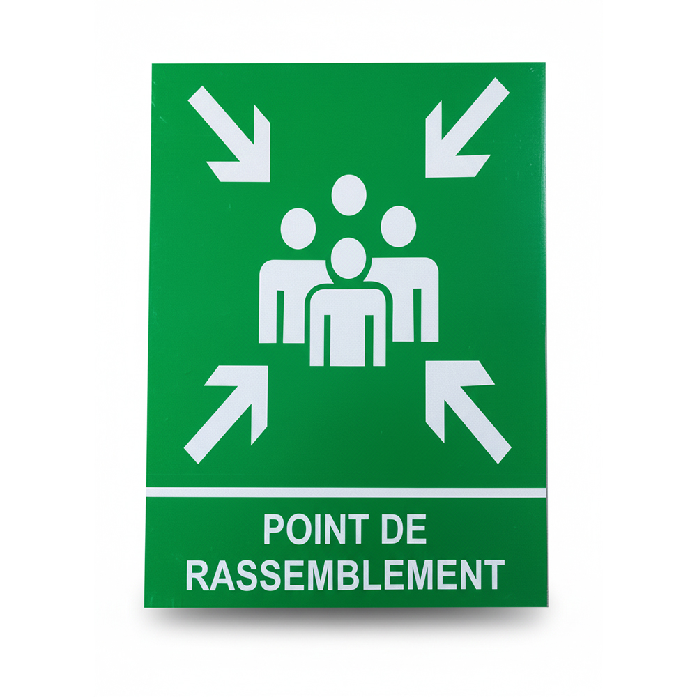 Ce panneau de sécurité « point de rassemblement » est conçu pour indiquer l’emplacement où les personnes doivent se regrouper en cas d’évacuation ou d’urgence. Il est facilement identifiable grâce à sa couleur verte vive, ses symboles de flèches blanches convergeant vers des pictogrammes de personnes, et son texte explicite « POINT DE RASSEMBLEMENT ».